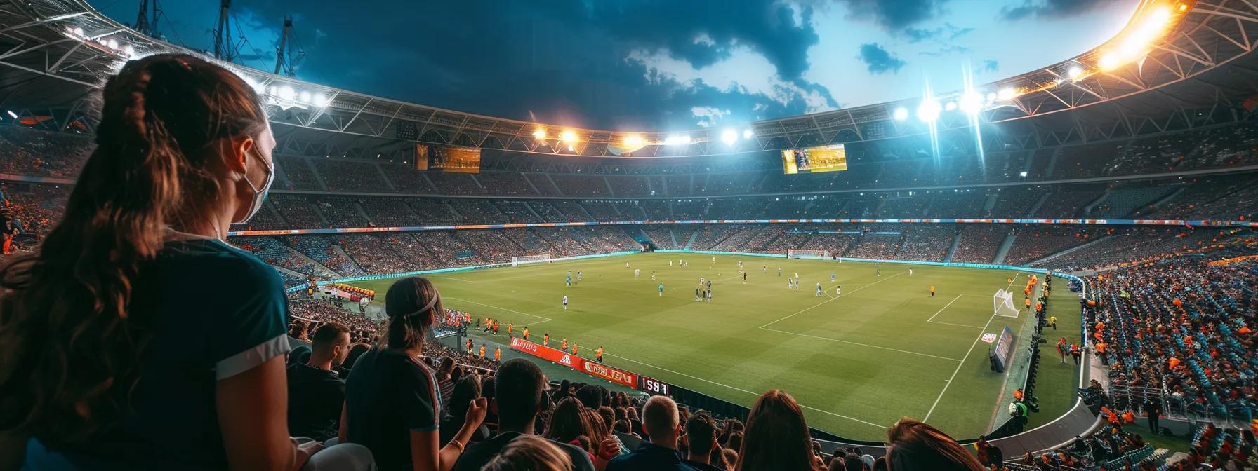 a vibrant urban soccer field filled with enthusiastic fans and players engaging in community activities, showcasing the dynamic spirit and unity of women's football as banners and digital displays celebrate local teams and grassroots initiatives.